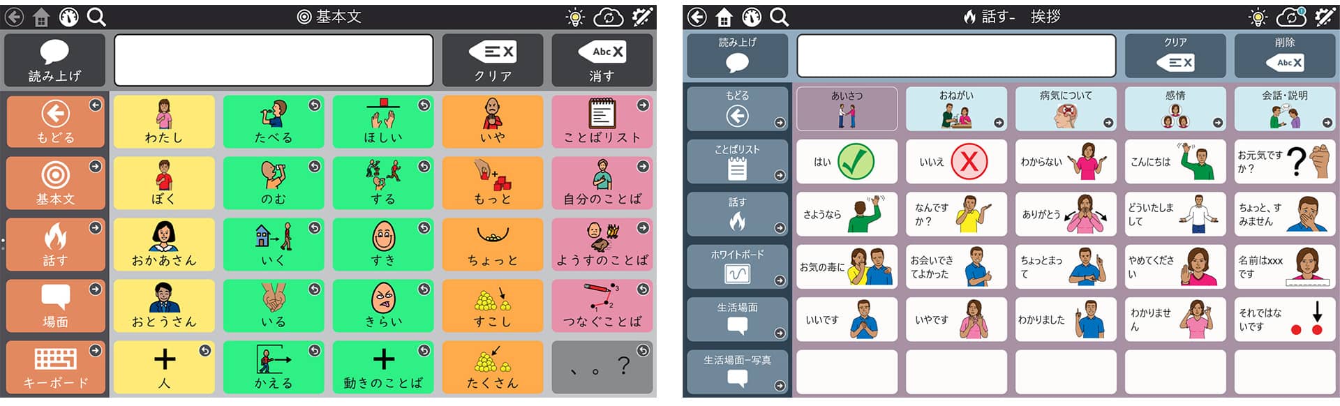 大人用では失語症のあるユーザーを意識した生活全般のページセットと、ALSのある方がすぐに使えるフレーズを使い易くまとめたGOMIPagesがあり、今日からすぐに会話できます。
